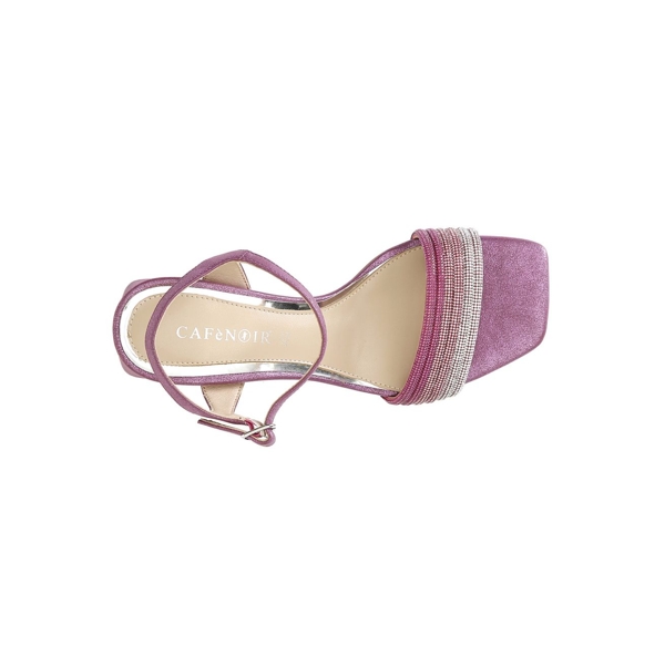 Sandali Donna Cafè Noir C1LB9014 colore fuxia. Sandali modello gilda effetto laminato con fasce sul davanti in strass. soletta in vera pelle. il tacco è di 50mm.