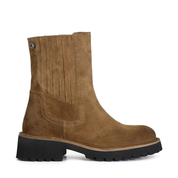 Tronchetti Donna CafèNoir C1FE6001 colore biscotto. tronchetto da donna in pelle scamosciata con elastici e fondo in gomma. Tacco alto 5 cm e soletta in pelle.